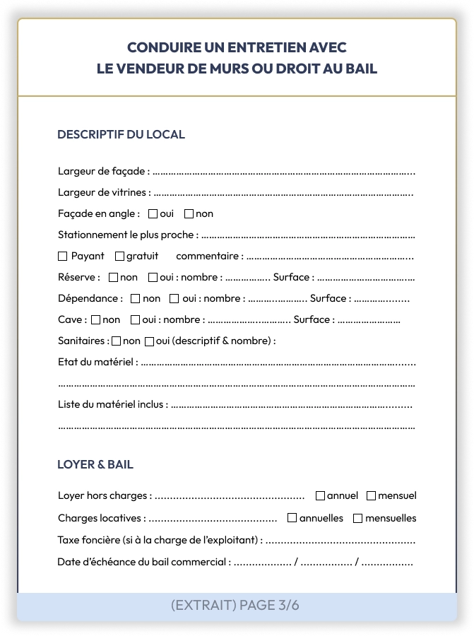 Ce document vous permet de conduire un entretien avec le cédant, en vue de réaliser un dossier de vente complet et professionnel.